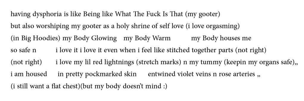 dre levant is a transmasc writer, artist, and soft blanket collector. their work is published with fifth wheel press, petrichor mag, Messy Misfits Club and is forthcoming with Kith Books, diet milk mag, and bloodbathhate. for snippets of poetry and cat pics, follow @drethepiper on Instagram and Twitter.